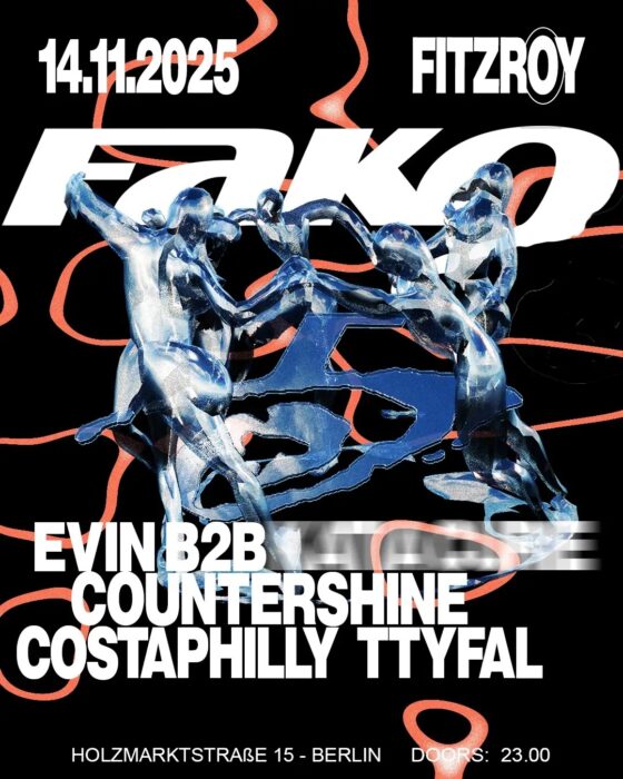 Wie geil ist das denn? We‘re back in Berlin, hosting another super cute and gorgeous event on November 14th at Fitzroy Be there, or whatever… honestly, your loss. We‘re bringing the b2b you’ve all been waiting for: evin and someone very special. We’ll spill the tea next week — let’s just say it’s a match made in heaven like Paris and Nicole. Our newest child ttyfal is taking a Sonderzug from Brussels to Berlin packed with hot, steamy tribal tracks (massive shoutout to SNCB for sorting us a train). Our very own bassline sharpshooter costaphilly is ready to set the decks on fire and of course prog ranger countershine can’t be missed either. So — this is it, the night you’ve all been waiting for. Tighten your shoelaces, finish that last sip of Fako, and focus! Get your presale tickets + fako lanyard ASAP. See you on the floor from 11pm onwards. No space for homophobia, sexism, or any kind of discrimination — an awareness team will be present throughout the whole night!
