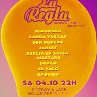 ¡Reglerxs lo prometido es deuda! Ya estamos de vuelta con fuerzas del verano para superar este otoño comiendo mango y rumbeando juntxs Se les va a olvidar el frío, porque les traemos un lineup bien caliente para una noche inolvidable ¡No permitas que te lo cuenten! Seit 1998 ist La Regla eine feste Institution der Latino-Community in Berlin! Live Acts und ausgewählte DJs spielen Cumbia, Salsa, Latin Bass, Perreo und feinste andere tropische Klänge. Oldschool-Sounds von Vinyl aus den Goldenen 70ern trifft auf brandneue Genres aus den Metropolen Lateinamerikas. Ein explosiver und äußerst tanzbarer Mix.